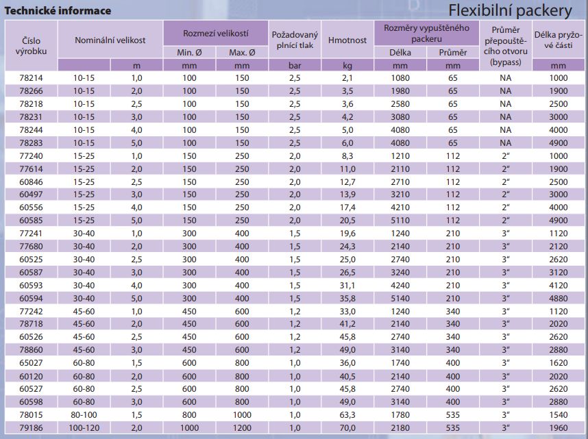 Tyto packery jsou vhodné na opravy poškozeného potrubí a spojů. Působením pryskyřice s výztuhou ze skalních tkanin zaručují těsnost a stabilitu opravovaného místa. Packery jsou flexibilní a proto mohou být umístěny pod určitým úhlem. Jsou dodávány v několika velikostech v průměru od 100 do 1200 mm. Délky packerů resp. jejich pryžových částí se pohybují od 1000 do 4900 mm.